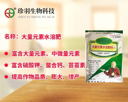 大量元素水溶肥料為經(jīng)水溶解或稀釋,用于灌溉施肥、葉面施肥、無土栽培、浸種蘸根等用途的液體或固體產(chǎn)品,可以葉面施肥、浸種蘸根、灌溉施肥,灌溉包括噴灌、滴灌等方式進(jìn)行灌溉時施肥,既節(jié)約用水,又節(jié)約施肥,而且還植物吸收快,大量元素水溶肥是一種可以完全溶于水的多元復(fù)合肥料,它能迅速地溶解于水中,更容易被作物吸收,而且其吸收利用率相對較高,我們看一下珍羽生物的大量水溶肥。